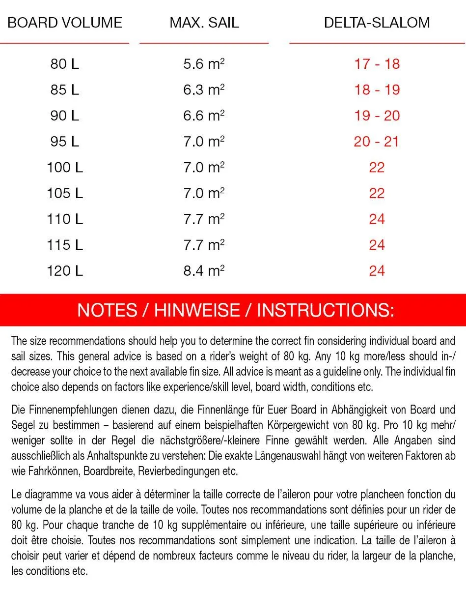 Ambitionierte Slalompiloten, die bei Niedrigwasser und/oder starkem Seegras Gas geben wollen, sollten zur Delta-Slalom greifen. Bedingt durch die breitere Basis kann die Finnenlä nge annä hernd halbiert werden. Die Delta-Slalom lä uft hervorragend Hö he, wird sehr schnell und bietet insbesondere in seichten Gewä ssern durch den hohen Rake erhö hte Sicherheit.