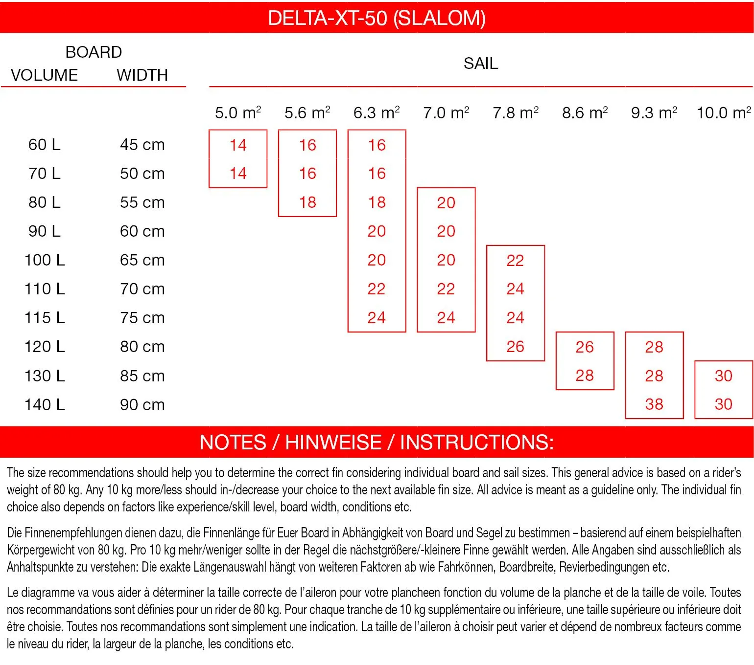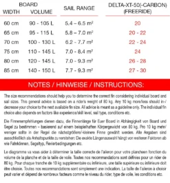 | Boardvolumen in l: | Segelrange in m²: | Delta-XT-50: |