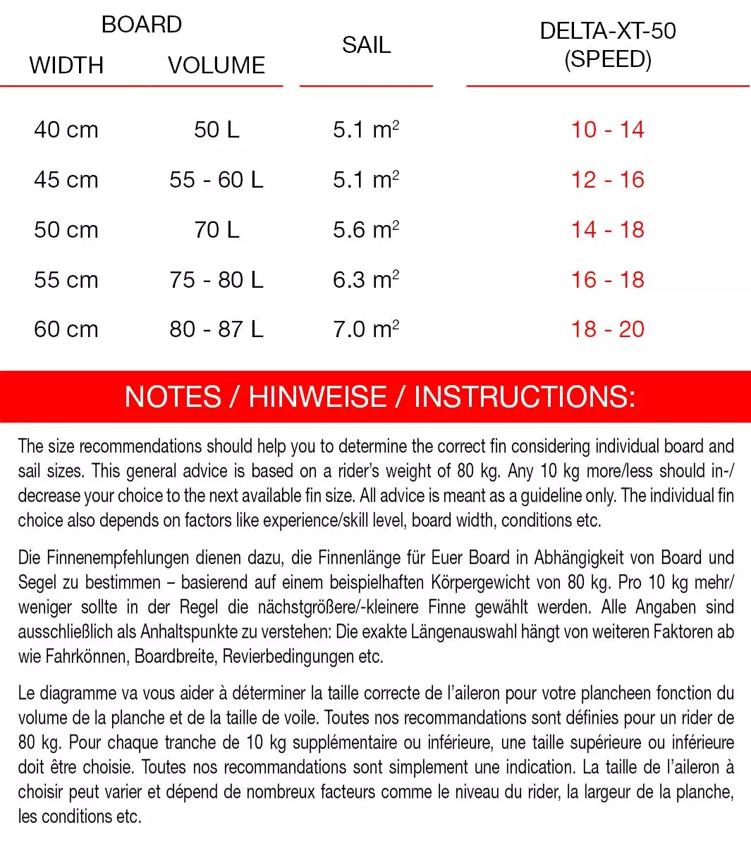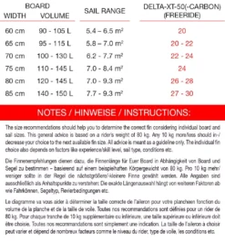 Die neu entwickelte Delta-XT-50 hat einen Rake von 50 Grad und ein sehr dü nnes, flaches Profil. Sie wurde intensiv in Dä nemark und Australien getestet und ist unser neuer Maß stab fü r Slalom, Speed und Freeride in sehr flachen Revieren und bei starkem Seegras. Extrem schnell und verlä sslich!