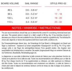 | Größe | Board Volumen (in Liter) | Segelgröße (in Quadratmeter) |