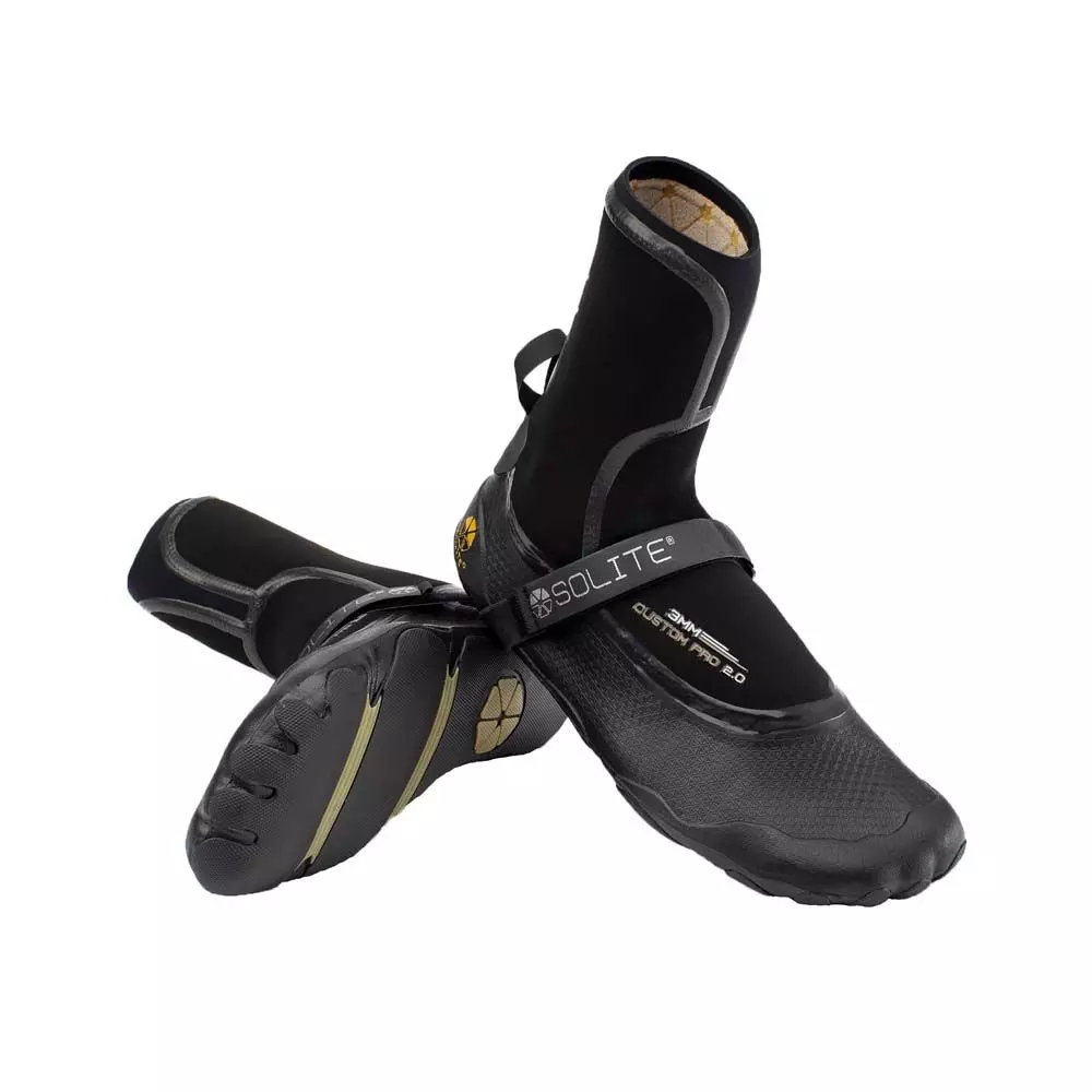 Die Solite 3mm Custom PRO 2.0 Neoprenschuhe haben einen High-Cut mit einem hohen Schaft, der bis über den Knöchel reicht. Dadurch ist er wärmer und bietet einen festen Sitz. Das Anziehen ist oft etwas mühsam. (Neopren-)Socken können das Anziehen erleichtern.