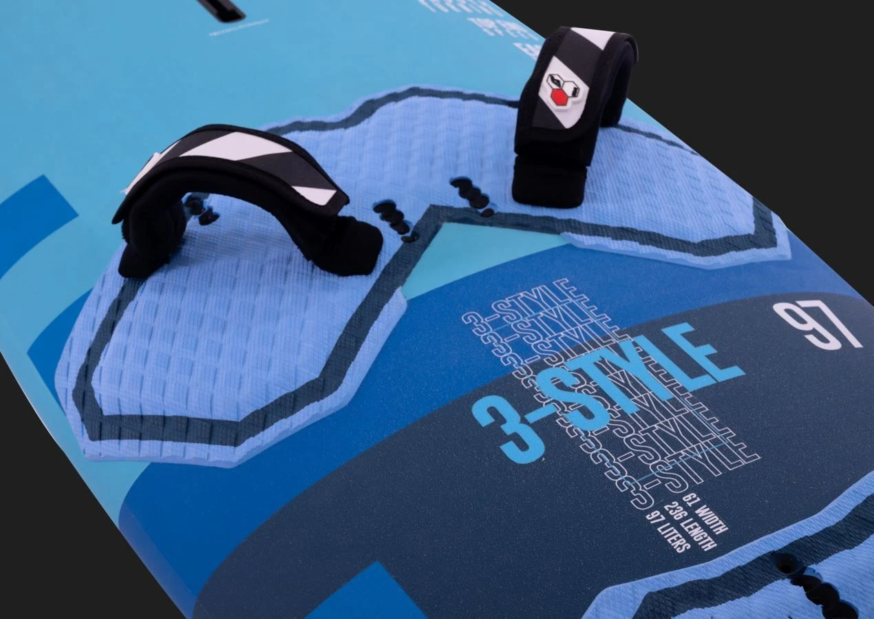 - Ausgeklügeltes Konkav mit flachem Heck und mehr V-Nase: Frühes Angleiten und erhöhte Manövrierfähigkeit bei Halsen und Turns